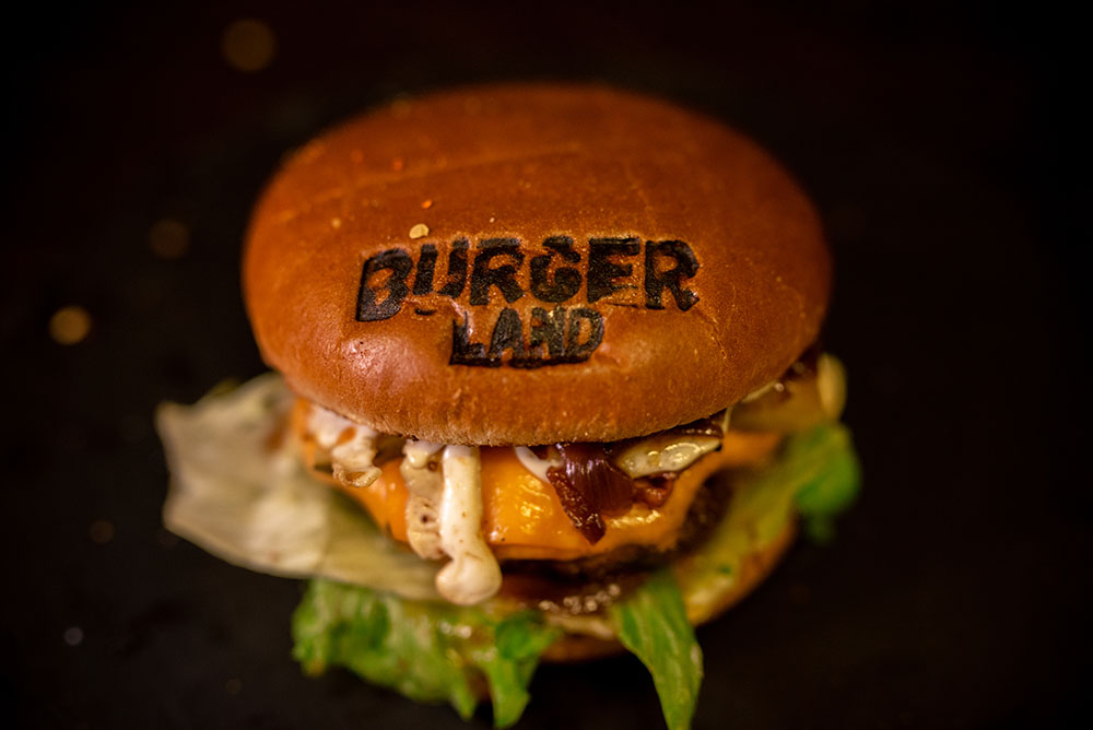 (chifla, sos burgerland, salata iceberg, rosii, castravete carne de porc ,mustar, ou, bacon, dulceata de ceapa rosie, sos bbq) 280gr